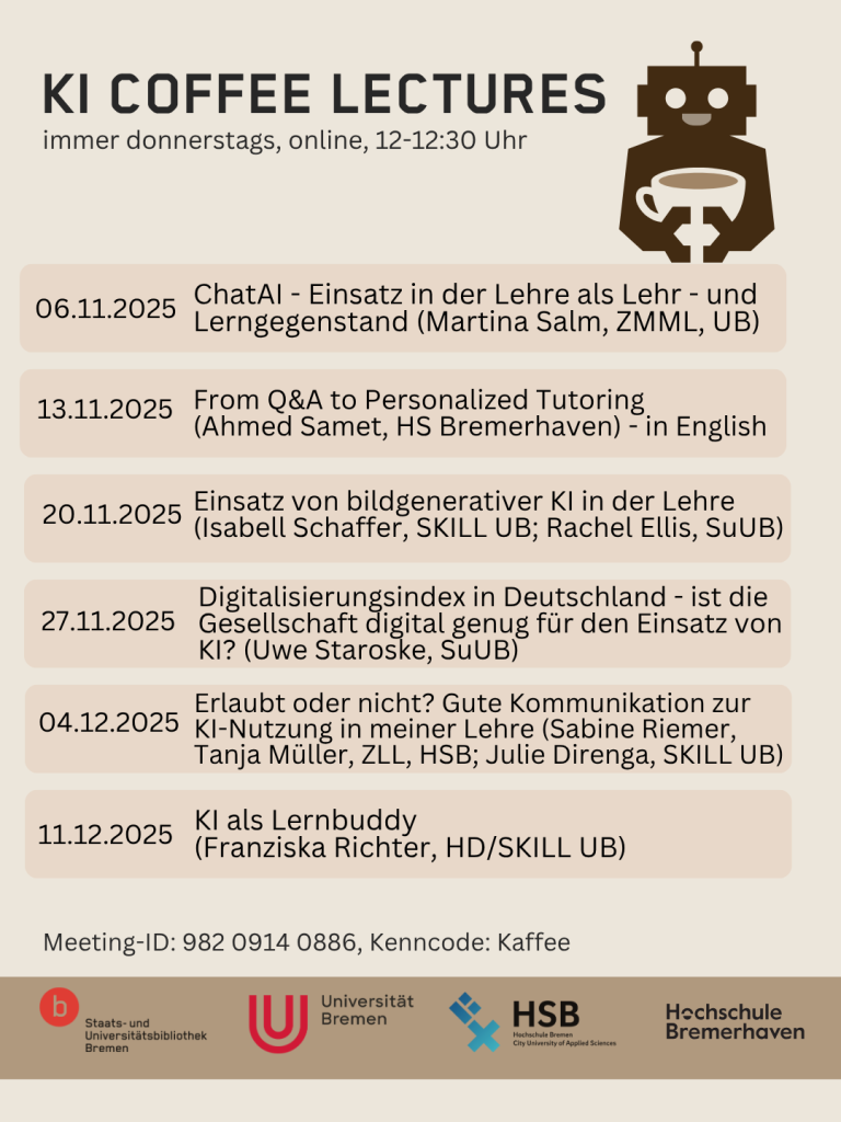 Wir laden wir Sie herzlich zu den nächsten KI Coffee Lectures ein – einer Online-Vortragsreihe rund um das Thema Künstliche Intelligenz. Gemeinsam mit unseren Kolleginnen und Kollegen der Hochschuldidaktik, dem Projekt SKILL-UB und dem Zentrum für Multimedia in der Lehre sowie dem Zentrum für Lehren und Lernen (ZLL) der Hochschule Bremen und der Hochschuldidaktik der Hochschule Bremerhaven bieten wir in kompakten 30 Minuten Einblicke in die vielfältigen Einsatzmöglichkeiten von KI in Wissenschaft, Lehre und Alltag.